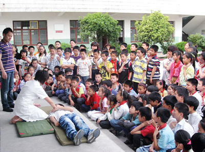 日前,竹马乡卫生院组织医护人员为全校师生开展了一场溺水、食物中毒等意外伤害急救的知识培训。通过讲座和心肺复苏现场演示,让大家知道在第一时间如何为患者进行正确的现场处置,以争取时间挽救生命。通讯员 严健洋 摄
