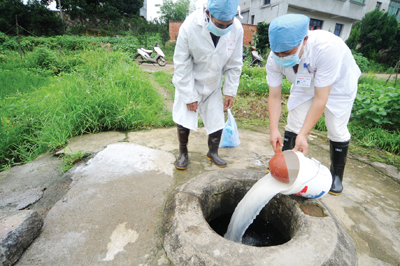 7月11日,婺城区疾控中心组织人员来到汤溪镇东祝村,对该村的水井、村民庭院进行全面消毒。据了解,前几日连降大雨,造成该镇东祝、下伊、高畈等10多个村庄进水,部分农田被淹。为防止水灾过后发生疫情,大雨过后,区疾控中心迅速组织人员发放药物,对进水村庄进行消毒。