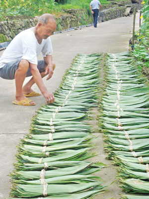 昨日,在沙畈乡银坑村,记者看到村民陈德宗正在晾晒采来的粽叶。据了解,粽叶学名为箬叶,生长在崇山峻岭中,生命力强,年年可采,可以说是山区百姓的“绿色银行”。从现在开始到8月份,该村村民大都会上山采摘箬叶,将其挑选清理晒干后,等待采购商上门收购,增加收入。“收购的价格一般在每公斤6到8元。”陈德宗说。记者 吕薇薇 摄