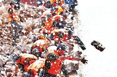 7月19日,受长江水位影响,江西九江彭泽县棉船镇金星村9组大堤出现崩岸险情,当地政府紧急调用民船拖运410立方米石块,驻扎在当地的400余名解放军官兵上船抛石,护堤固坝。图为,解放军战士将巨石推入滚滚长江中。