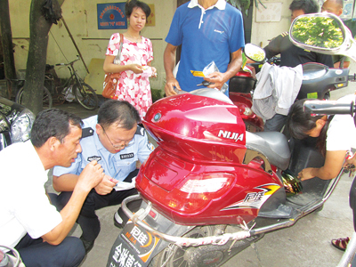 昨天一大早,记者就在白龙桥派出所旁看到,不少车主正排队等候着给电动自行车上“户籍”。“不要着急,让我们先查一下车架号、电机号,填好登记表。”53岁的派出所民警老张热情地接待了前来办“户籍”的村民。