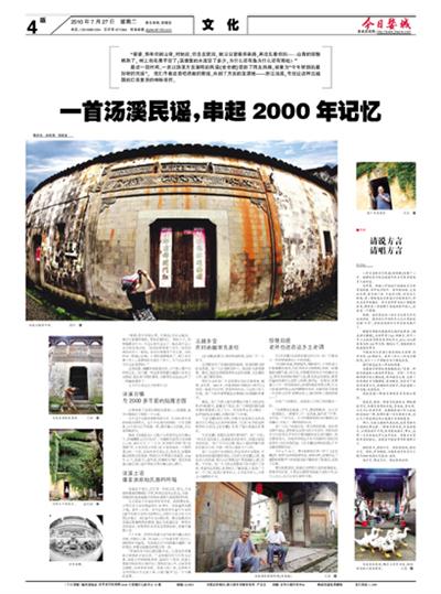 “有流传至今的山歌民歌为证,以及还保留着原汁原味的乡俗民风。”退休教师范天行告诉记者,汤溪人特别能歌善唱,每逢红白喜事,汤溪人都能用唱的形式来抒发心情和述说心声。办喜事有出嫁歌,办丧事有丧歌。汤溪人的口语,也很难完全用书面汉字记录下来,只能“翻译”出一个大概的意思。