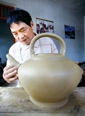 问起现在陶壶的生意好不好,吴根法欣喜中又带了些许的惆怅。他说,现在这种传统的陶器不但没被淘汰,而且很受欢迎。用陶罐烧的水,清冽可口,水质纯正;陶壶装的水,不仅清凉甘甜,而且还不易发馊。这些年都不断有人上门选购,现在则是直接定货,基本上是烧多少,就拿多少,而且价钱卖得也很好。让吴根法有些惆怅的是敌不过时光的力气和身体。他今年已经66岁了,以前一次能揉100多个茶罐的泥,一天能拉40多个坯,但现在他已经吃不消了。