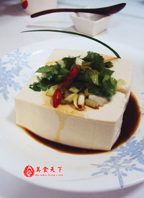 把豆腐焯水,再过冰水,再放冰箱里冻着(用冰块最好),吃的时候放上葱花,简单淋上橄榄油和酱油就可以。