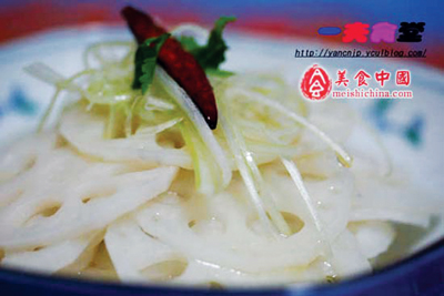 藕切片,找一个砂锅或铝锅烧开水,藕烫大概两分钟左右,捞出,过凉,多加白醋,多加糖,少放点盐和香油,拌均匀。(注意:煮藕一定不要用铁锅,否则藕会变黑,影响美观。)