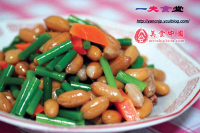 把花生米捞出来,趁热,拌上盐、糖、味精、香油,然后拌入蒜薹与胡萝卜。(注意:煮花生的时候,不要放盐,如果放了会变成黑色。)