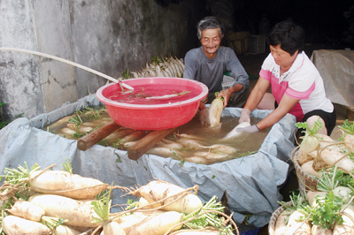 近期正值北山萝卜收获上市。7月1日上午,记者在市郊北山海拔近千米的罗店镇盘前村看到,一些村民正在清洗刚收割的萝卜。该村是有名的高山蔬菜生产专业村,北山萝卜以色白、汁多、味鲜而在市场上享有较高知名度。该村64岁的村民潘基云说,今年自己刚卖了第一批萝卜,目前批发价格约为每公斤8角至1元左右。记者 吕薇薇 摄