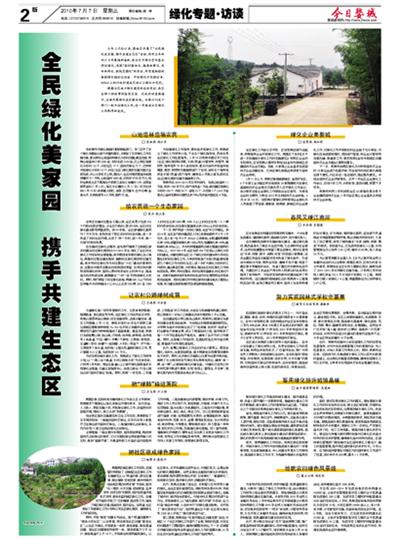 根据全区城乡绿化建设的总体目标,我区各部门积极贯彻落实区委、区政府的重要指示,全面开展绿化美家园活动。本报今刊发十部门一把手谈绿化工作,进一步推动全区绿化工作取得新成效。