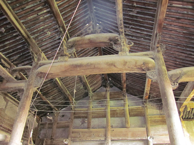 吴世基说,以前戏院后厅并没有门,售票口设在西厢房北侧,两边厢房都有门口出入,现在东厢房门口已经封闭,西厢房北侧还有一扇小门。我们转出后厅,从小门进到戏院。整个戏院前厅面阔五间,后厅面阔三间,东西设有厢房,面阔六间,中间设天井,组成回字状。戏院总占地面积561平方米,建筑面积307平方米,很有开阔之感。