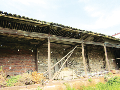 罗店镇西吴村,是远近闻名的养鳖专业村和苗木种植村,村民大都以此为业。在该村的环溪下街,坐落着一个清代古戏院,如今,戏院已经荒废多年,天井内绿草萋萋,但主体结构依然完好,述说着它曾经有过的极盛时光。从村口进去,绕过一些近些年盖起来的新房,古戏台藏在村庄深处,坐北朝南,粉墙黛瓦,中设天井,回廊相携。沿着道路进来,最先看到的是靠北的后厅,两扇木门合起,铁锁已经锈迹斑斑。推门进去,里面摆放着一些碾米的工具,上面布满灰尘和蛛网。整间厅堂十分宽阔,横梁高且大,透过厚厚的灰尘,还能看到细致的牛腿雕花。据随行的老会计吴世基说,戏院的后厅原本是供以前观众作息和摊贩摆摊用的。只是现在后厅的南面用水泥块砌上一道墙,把它与整个戏院隔开。