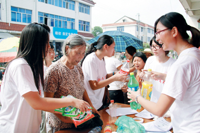 昨天,浙江工商大学“夏日风采”暑期社会实践团金华组的队员们来到婺城区洋埠镇开展“爱我新家园、环保新生活”的环保宣传活动。活动中,居民们可凭废电池、塑料瓶子等物品换取清凉油、肥皂、牙刷、沐浴露等生活用品。 记者 李丹 摄