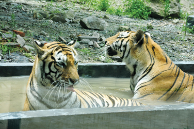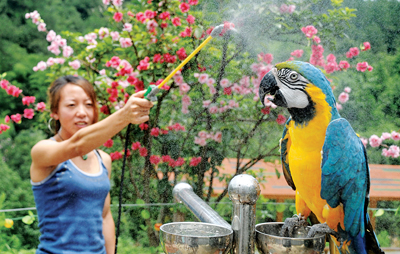 体形硕大的东北虎有一个10平方米的大水池,定期会有新鲜的自来水注入水池,东北虎三三两两下到水池里泡凉水澡;棕熊很怕热,每隔2至3小时就要冲凉降温。饲养员拿着水管给笼子里的地面洒水,棕熊连忙靠近,一边喝水,一边享受淋浴。喝饱了水洗完澡,棕熊抖了抖身上的水,躺下“闭目养神”;金刚鹦鹉正在享受饲养员给他们的“淋浴”。动物园负责人告诉记者,入夏以来,工作人员每天会在各个动物的笼舍里喷水,对地面进行降温。此外,他们还十分注意动物的健康,对兽舍注意进行遮阳,保持兽舍通风,同时在饲料中加大了蔬菜、水果的比例,加快戏水池的换水频率,避免动物“中暑”。
