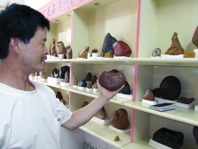昨日,记者在白龙桥集镇上看见一家黄蜡石店,据了解,石头的主人是白龙桥怡村村民倪雁林,他说,自己玩石头四、五年了,曾经在八咏楼摆过地摊,生意越做越好,今年6月在镇上开了家石头店,比以前种田的收入好多了。