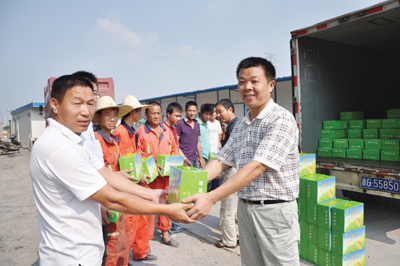 8月酷暑难耐,却是路面施工的黄金时间。8月5日下午,婺城区总工会组织人员来到正方交建婺城新区拌和中心,慰问在烈日酷暑下仍坚持高温劳动的工程建设者,并向工程人员送上了清凉饮料。区总工会负责人希望工人们在工作中注意自身防暑和安全,同时也希望企业要尽量为员工提供一个良好的工作条件,营造和谐的企业发展环境。通讯员 叶丽青 摄