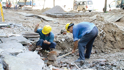 连日来,市区持续高温,但市重点工程双龙南街道路优化工程依旧如火如荼地展开,各施工单位按计划抓紧施工,确保按期完工。图为金华市自来水公司员工在对自来水管道进行施工。