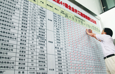 昨天,记者在金西开发区管委会看到,为了抓好今年的“一号工程”——41个工业项目的落地建设,开发区管委会在一楼大厅树立起了巨大的“工程进度公示牌”。每一个管委会领导和干部的名字都榜上有名。据了解,百日攻坚期间,开发区将以各种方式全力督促各项重点工程的实施情况,并进行通报、表扬,不断提高干部的积极性,争取百日攻坚真有所“攻”,有所“成”。