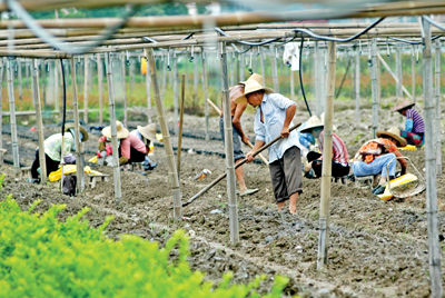 日前,在蒋塘镇开化村附近田头,10多位村民在苗木大棚里忙碌着,松土、移栽、播种,有条不紊的进行着。据了解,这两年苗木俏销,苗木种植户也纷纷扩大种植规模。搭建设施大棚,采用覆膜、喷淋等技术,保障容器苗的成活率。大规模种植也使苗农收益大增。