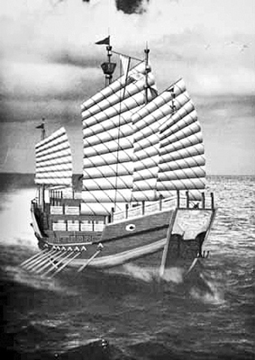 据史料记载,在郑和下西洋的船队中,宝船长44丈4尺,宽18丈,载重量800吨。它的铁舵,需要二三百人才能举动。图为郑和宝船的复原图。