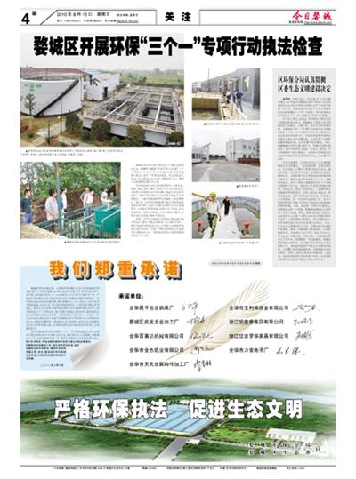 婺城环保分局认真开展2010年“整治违法排污企业,保障群众健康”环保专项行动,暨“三个一”活动,7月19至22日,对辖区内省、市重点监管污染企业进行了专项执法检查,共出动执法人员48人次,检查企业60家,采集水样35个,现场下达限期整改通知书6家。