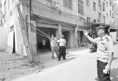 8月13日上午,婺城区村(居)民违法建房专项整治工作领导小组对新狮街道高村内乱搭乱建、占道经营的64处违法建筑进行集中拆除。下一步,市行政执法局婺城分局将加强监管,杜绝私自抢建、扩建、乱搭乱建现象回潮。记者 方晟 摄