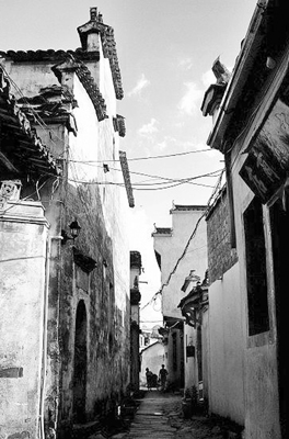 所以,当更多的“我”从现代生活中突然步入这一片恬静的村落,她所呈现出来的古朴、典雅、沉静之美就会使我们震慑,那斑驳的马头墙、低矮倾斜的木屋、石雕、漏窗、斗拱、飞檐包容着无限的内涵,每当我将全部身心沉浸在这冷峻、肃穆的意境之中,一种十分熟悉的孤独恬淡之情便轻轻地袭来……
