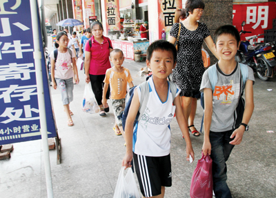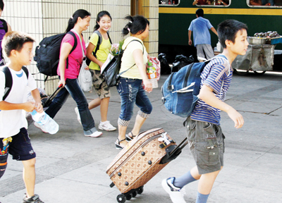 8月15日,记者在金华火车西站看到,随着新学期的临近,这些到金华和父母一起过暑假的“小候鸟”们结束了假期,在家长或亲友的陪同下结伴返乡。一位贵州籍王先生告诉记者:“一来马上开学了,把儿子早点送回去,好让他在家收收心,准备上学;二来提前几天送他回家,避开月底乘车高峰,这样可以轻松点。”记者 方晟 摄