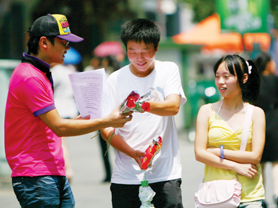 昨日,在市区街头,几个手拿鲜花叫卖的小青年特别引人注目。“哥哥,买枝花给姐姐吧!”“叔叔,献一份爱心帮助张梦婷同学圆大学梦吧,谢谢您了!”他们不知疲倦地奔跑着,希望手中的鲜花可以售空。