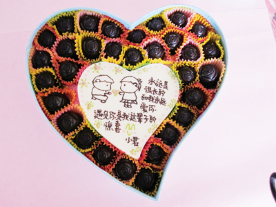 据介绍,今年最受欢迎的DIY巧克力,是画上两头猪的“猪公猪婆”和做出各种鬼脸的“表情”,还有专门为七夕准备的“七夕快乐”。最有新意的巧克力,则属一位兰溪顾客制作的“情书”:外面玫瑰花型的巧克力包围着中间一颗大大的爱心,中间画上了两个小人,再写上自己要说的话,精致又别具特色。还有一些顾客,把戒指包在了巧克力里面,准备送给情人一份特别的惊喜。