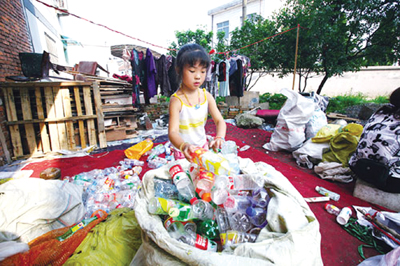 8岁的范真真跟着收废品的父母住在洪源社区的出租房。每天,范真真都会把收集起来的饮料瓶装进袋子,再跟着爸爸出去收废品,帮父母的忙。有空闲的时间,就跟几个亲戚家的小孩子一起玩耍。范妈妈说:“我平时忙,基本没什么时间带她去玩,但真真很乖,从来都不用担心。”