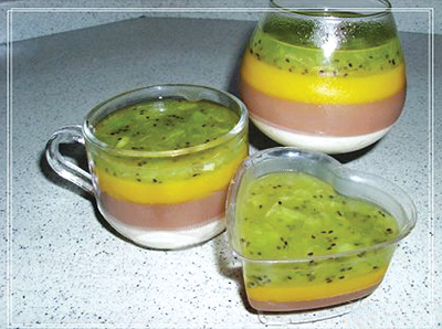 3.等果汁冻起来后再加第三层果汁,继续速冻15分钟,等第三冻好后,在上面铺上猕猴桃果汁就可以食用。