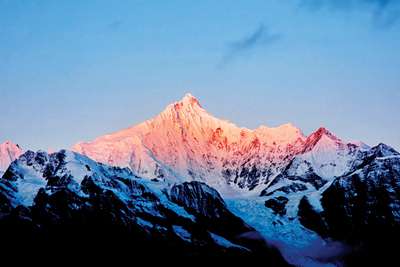 六点零五分,日照金顶奇迹般诞生!但瞬间消失,很多人都错失了这最佳的三四分钟,因为只这个时间出现的金色最浓重。此后,厚重的云一直在快速地移动,但我想肯定还会有奇迹发生。果真,六点二三十分,更大的日照金顶出现,虽然没有前面的金色,但依旧是惊喜,这次持续时间长达六七分钟!而后,天愈来愈亮,六点半后,面前的卡瓦格博主峰便是清清爽爽,一片圣白。