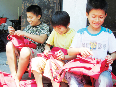 张庆高兴地说:“修剪100个小书包的线头可以有3元钱收入,每天他可以赚到10元左右。”加工点负责人告诉记者,在这里干活不仅可以锻炼孩子,还可以杜绝小孩暑假期间外出玩耍的不安全隐患,只要孩子们工作认真,他们很愿意接收这些孩子。