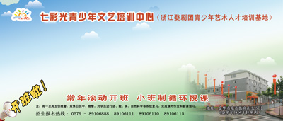 七彩光青少年文艺培训中心是由浙江青少年艺术人才网、浙江婺剧团、金华市婺城区青少年文学艺术促进会联合创办的一所集教学研究和培训于一体的综合性、高素质专业青少年文艺培训机构。中心座落在婺江北岸的金华军分区干休所内,环境优美、交通便利,配套设施齐全、教学课程丰富、师资力量雄厚、权威媒体平台支撑,设有大小教室、舞蹈房、琴房、活动室、多媒体教室、演播厅等25间教室。