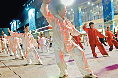 近段时间天气炎热,一到晚上,总会有不少市民到附近的广场或花园纳凉、锻炼,有的打太极拳,有的跳排舞,有的练三步、四步……你看,这群太极拳爱好者的一招一式有模有样,让人不禁心生羡慕。市民刘女士表示,自己白天要忙于上班,到了晚上只要有空就会出来走走,或打上几套太极拳,出身汗,胜过闷在家待在空调房里,这既环保又有益健康。