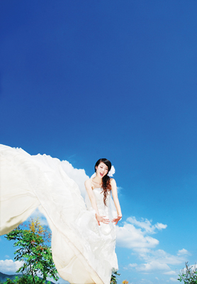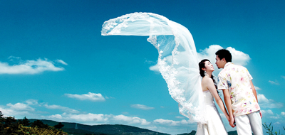 一万无际的蓝天下,晶莹碧绿的山泉一路跳跃着奔走,时而停留在树底,形成一湾清潭。青山绿水间,一对对的情侣身披洁白的婚纱,在这美景前留下自己最幸福的时刻。