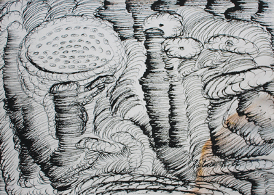 四年前,作为一名颇具传奇的女画家,陈梦兮曾引起金华书画界的关注,一时颇受好评。太平天国侍王府博物馆副馆长蒋鹏放曾说,她的部分画作具有“欧洲铜版画的味道”。报道她的消息一经网上传播,毁誉参半。她依然故我,写诗画画,她知道她在做什么,哪怕有人说她的画是涂鸦,她也不以为意。2008年秋,记者在茗一画廊遇见她,她已经从圆线派转向回溯流派(两派皆属她自创,国内外并无此绘画流派),此时的她,生活窘困,创作却抵达了一个丰收期。然而,她行踪飘忽不定。直到2010年7月底,记者再次遇见她,她的回溯派作品已经结集成册,生活仍然不见起色,记者问她,“绘画是你的全部兴趣?”她立刻纠正:“绘画是我的生涯,不是兴趣。”