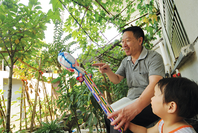昨天上午,在市区古子城八咏路一居民楼院大露台上,住户金大爷坐在绿色植物底下,惬意地带着孙女乘凉做游戏。记者 胡文英 通讯员 金姗姗 摄