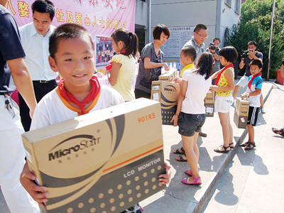 9月8日上午,八婺旅行社为安地小学的同学们送来了20台新电脑。看着一台台崭新的电脑搬进教室,同学们脸上都挂满了笑容:“有了新电脑,我们上课就能一人用一台电脑了。”