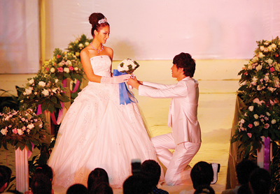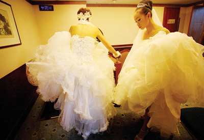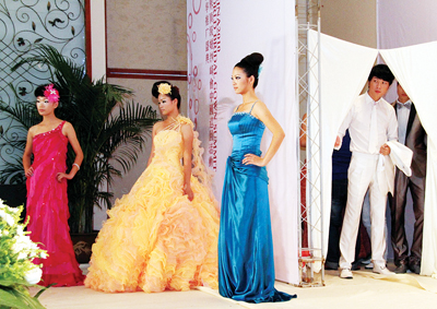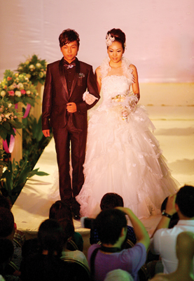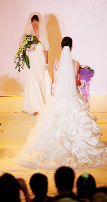 明快的音乐声中,一群姿容艳丽的女模特身着经典的婚纱,在T型台上款款走过,如同飘逸的蝴蝶,追逐着花香。这些美丽的嘉宾高贵而冷艳,吸引了人们的目光。