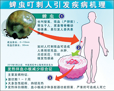 监测显示,此类病例极少在城市人口中发现,病例多为成年农民,主要分布在丘陵地区。疾病临床表现主要为发热伴血小板、白细胞减少等,多急性起病,可伴乏力、纳差、恶心,部分病例可出现黑便、牙龈等部位出血等症状,部分病例可出现肝肾等多脏器功能损害。