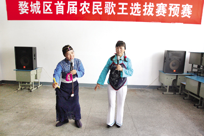 “唱山歌啦,唱起山歌欢乐多啊快乐多,家住双龙神仙地……”昨天,罗店镇洞前村农民方永清一段高亢激昂的原生态山歌《唱双龙美景》,令在场的评委们称赞不已。当天,首届婺城区农民歌王选拔赛在市区假日中心开赛。来自全区各乡镇、街道的近百名“农民歌王”一展歌喉,参加了美声、民族、戏剧、原生态、通俗等5个类别的比赛。区委常委、宣传部长傅关福观看了比赛。 记者 孙武斌 方晟 摄