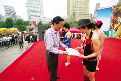虽然迎来了初秋的绵绵细雨,但丝毫阻挡不了台上演员们激情四射的魅力。轻松欢快的节奏、整齐划一的舞步、色彩绚丽的服饰、婀娜多姿的演员……台上的演员跳得奔放,台下的观众看得艳羡。昨天,在市区人民广场举行的第六届“双龙之夏”文化旅游活动闭幕式暨“激情婺城.双龙杯”排舞大赛,着实让观众连呼看得过瘾。