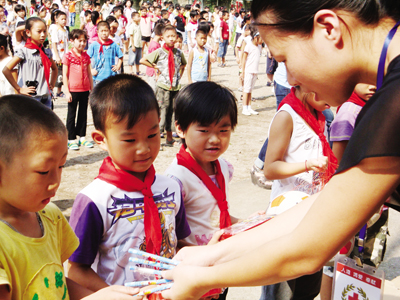 日前,婺城区红十字会工作人员来到安地小学,为那里的同学们带去了足球、文具盒、圆珠笔、铅笔等价值一万五千余元的文体用品。见习记者 徐逢迅 摄