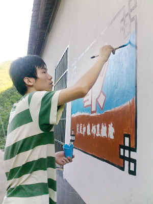 近日,中国计量学院艺术系的学生在学院老师的带领下来到箬阳乡茶园村,在刚修缮完毕的茶园村大礼堂墙体上作大幅墙画,为茶园村的新农村建设“锦上添花”。