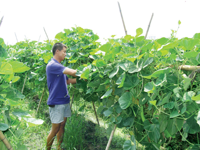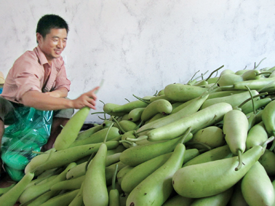 昨日,记者在白龙桥镇天姆山村村民蒋金春的家里看到,一楼的5个房间里堆满了蒲瓜。蒋金春告诉记者,今年他种了30多亩蒲瓜,正常的话,一天可以采收8000斤左右,而且今年蔬菜价格特别好,温州、杭州都有固定客商上门收购,预计收益在20万元以上。