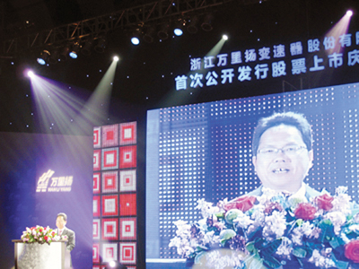 6月18日上午,金华市委书记徐止平和浙江万里扬变速器股份有限公司董事长黄河清敲响深圳证券交易所的开市宝钟,浙江万里扬变速器股份有限公司正式在深圳证券交易所挂牌上市,公司股票简称“万里扬”,股票代码002434,成为婺城首家上市企业。万里扬是一家专业从事商用车变速器生产并为国内大中型商用汽车厂家提供配套的龙头骨干企业,目前已形成年产30万台商用变速器的产销规模,其生产的WLY530C21变速器被认定为东风猛士军车指定变速器,2008年荣获国家科技进步一等奖,这是我国汽车行业22年来获得的唯一一个国家科技进步一等奖。目前,万里扬公司拥有浙江金华、湖南长沙、北京通州、湖北武汉等多个生产基地,自主研发生产12大系列变速器,产量稳居全国第一位,产值名列全国行业第二位。
