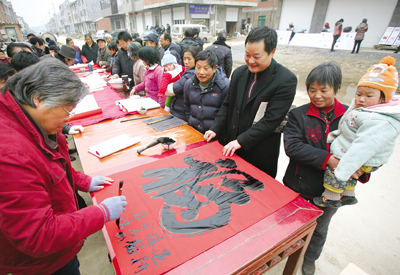 昨天上午,金华市漫画家协会组织一批书画家走进上邵九峰移民新村,举办“送春联下乡”的活动。活动当日,村民们早早就赶到现场等候,邀请书画家为他们即席挥毫,书写各自心仪的春联,红红的春联立刻就让村民们感受到了浓浓的节日氛围。记者 方晟 摄
